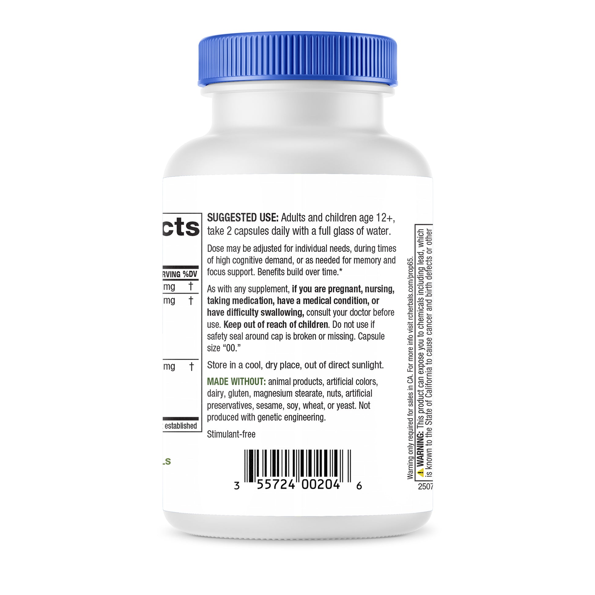 Artificial colors, dairy, gluten, magnesium stearate, nuts, preservatives, sesame, soy, wheat, or yeast. Not produced with genetic engineering. Capsule size “00.”